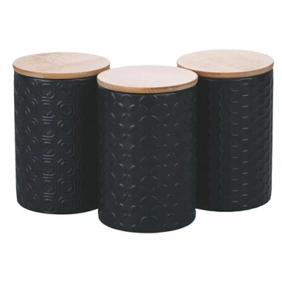 Set of 3 jars Shapes Geometrie Ceramic Bamboo lid Closure with silicone seal Matt finish Dimensions: Ø 10 x h. 15 cm Embossed decoration Dishwasher safe without lid Capacity: 750 ml Colour: black, natural wood lid Set of 3 Shapes Geometrie Ceramic Jars Bamboo lid; Silicone seal closure Matt finish; Dimensions: Ø 10 x h. 15 cm Embossed design; Dishwasher safe without lid