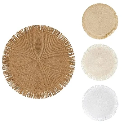 Round placemat with fringes Chocolate Jute effect paper Available in 4 different shades of chocolate Braided decoration Measurements: Ø 38 x h. 0.3 cm