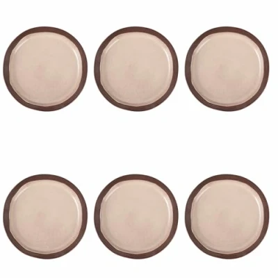 Villa d'Este Home Tivoli Set of 6 Beige Stoneware Dinner Plates, Brown Edge, Bretagne Terra