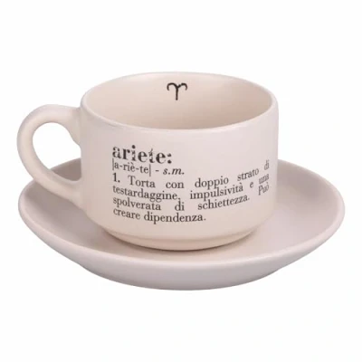 Victionary coffee cup with saucer, New bone china with handle Decoration with Aries zodiac sign description Capacity: 90 ml Cup measures: Ø 6.5 x h. 4.5 cm. Saucer dimensions: Ø 11 x h. 1.8 cm Victionary coffee cup and saucer; New Bone China With handle; Aries zodiac sign description decoration Capacity: 90 ml; Cup dimensions: diameter 6.5 x h. 4.5 cm Saucer dimensions: diameter 11 x h. 1.8 cm; Dishwasher safe