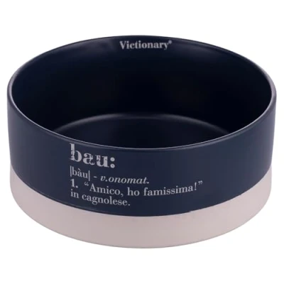 Victionary Bau Large Stoneware Bowl Exterior matt finish and inner gloss; Meow lettering Dimensions: diameter 19 x h. 8.5cm; Capacity 1400ml Dishwasher safe; Ideal as a treat bowl or water bowl Colour: blue