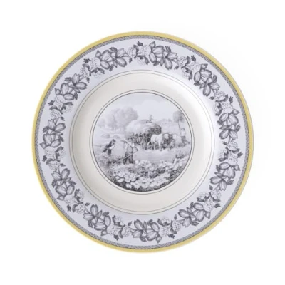 Elegant dinner plate with detailed landscape pictures in copper engraving style is ideal for use everyday or for the banquet table Size is suitable for serving various dishes with side dishes, Perfectly combinable with the Audun Ferme collection Thanks to its simple shape it is also Ideal for catering, Can be carried with one hand, Can be stacked inside each other, Dishwasher safe Dishwasher and microwave safe, High quality: Premium Porcelain made in Germany Contents: 1x Villeroy & Boch Audun Ferme dinner plate (27 cm), Material: Premium Porcelain, Colour: white/grey/yellow