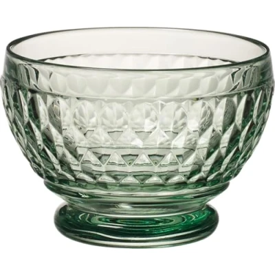Elegant dessert bowl made of green crystal glass with decorative relief for stylish serving of desserts and snacks Ideal size for desserts of all kinds, Also perfect for finger food such as nuts and olives, Perfect to combine with tableware from the Boston collections Also suitable for gastronomy thanks to its handy shape, Stackable inside each other High quality crystal glass provides dishwasher resistance and long-lasting shine Contents: 1x Villeroy & Boch Boston Coloured Dessert Bowl (430 ml), Material: crystal glass, Colour: Clear/green
