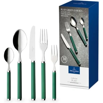 Cutlery with green plastic handle for up to 6 people, All-rounder for everyday use and as an original gift idea Can be used from appetizer to dessert: 6 tablespoons, 6 forks, 6 knives, 6 coffee spoons, 6 dessert forks Easy to hold, Thanks to colourful plastic handle it is also suitable for outdoors, Can be combined with various Villeroy & Boch collections High quality: Stainless, dishwasher safe and polished stainless steel, Neutral taste, For daily use Contents: 1x Villeroy & Boch Play! Green Garden cutlery 30 pieces, Material: stainless steel, plastic, Colour: green