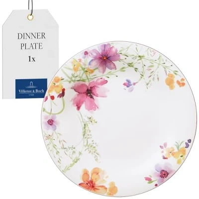 Elegant dinner plate with floral decor for stylish serving at any occasion, Also ideal as an original gift Size is suitable for serving of main dishes, cake or desserts, Can be combined with all Mariefleur products, The bright colours are an eye-catcher Thanks to its handy shape and portability with one hand, it is also ideal for gastronomy, Stackable, Shock and impact resistant edges, Dishwasher safe Dishwasher safe, Suitable for microwaves and ovens up to 200 °C, High quality: Premium Porcelain Made in Germany Contents: 1x Villeroy & Boch Mariefleur Basic Dinner plate, Dimensions: Ø 27 cm, Material: Premium Porcelain, Colour: White