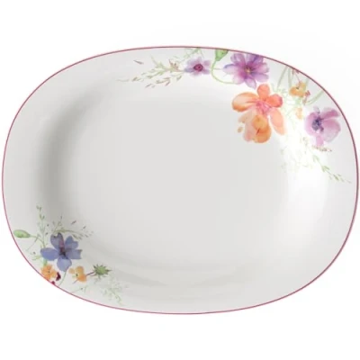 Charming serving platter with lovely floral decoration for stylish serving of roasts and side dishes, Ideal For special occasions Slightly raised and wide rim for clean serving, Optimal for different dishes, Eye-catching flowers Thanks to handy shape it is also ideal for catering, Can be carried with one hand, Stackable in each other, Shock and impact resistant edges, Dishwasher safe Dishwasher and microwave safe, High quality: Premium Porcelain made in Germany Contents: 1x Villeroy & Boch Mariefleur Basic serving platter (34 cm), Material: Premium Porcelain, Colour: white/multicoloured