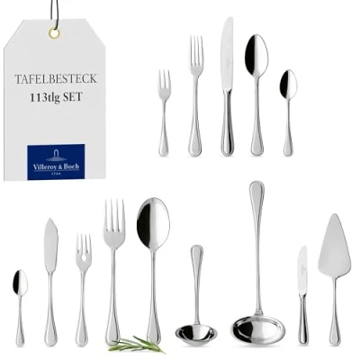 Elegant stainless steel cutlery with slightly curved lines for up to 6 people, All-rounder for everyday use or for festive occasions 12 spoons, 12 forks, 12 knives, 12 fish forks, 12 fish knives, 12 coffee spoons, 12 espresso spoons, 12 cake forks, 12 cake knives, 1 vegetable fork, 1 vegetable spoon, 1 sauce spoon, 1 soup ladle, 1 cake lifter Rounded shape for a good feel, Can be combined with various Villeroy & Boch collections High quality dishwasher-safe and polished stainless steel, Neutral taste for daily use Contents: 1x Villeroy & Boch Neufaden Merlemont Cutlery-Set 113-pieces, Material: stainless steel
