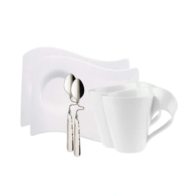 Villeroy & Boch New Wave Cappuccino Set, 6 Pieces, Coffee Cup, Premium Porcelain Saucer, Stainless Steel Spoon for 2 People, Dishwasher Safe, White