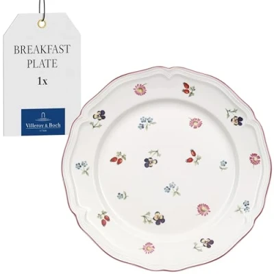 Elegant breakfast plate with playful floral decoration for serving smaller dishes, Ideal for the classic coffee or breakfast table Small size is suitable for serving breakfast or desserts, Can be combined with the romantic Petite Fleur series Thanks to its handy shape and portability with one hand, it is also ideal for gastronomy, Stackable, Shock and impact resistant edges, Dishwasher safe Dishwasher safe, Suitable for microwaves and ovens up to 200 °C, High quality: Premium Porcelain Made in Germany Contents: 1x Villeroy & Boch Petite Fleur breakfast plate, Dimensions: Ø 21 cm, Material: Premium Porcelain, Colour: White