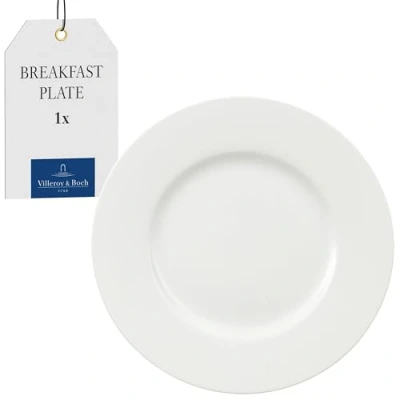Classic breakfast plate in timeless design for smaller meals, Ideal companion in the morning or on the elegantly laid festive table Size is suitable for serving breakfast, cake, dinner or antipasti, Glossy porcelain perfectly complements the Royal range Thanks to its simple form, it is also ideal for gastronomy, Can be carried with one hand, Stackable, Shock and impact resistant edges, Dishwasher safe Dishwasher safe, Suitable for microwaves and ovens up to 200 °C, High quality: Premium Bone China Made in Germany Contents: 1x Villeroy & Boch Royal breakfast plate, Dimensions: Ø 22cm, Material: Premium Bone China, Colour: White