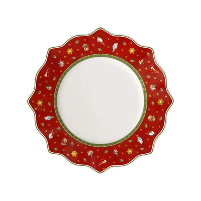 Add a nostalgic flourish to your Christmas table with the Villeroy & Boch Toys Delight Red Flat Plate. Framed by a festive red border and finished with gently scalloped edging, this plate is decorated with illustrations inspired by vintage toys—drawing on classic themes that evoke the charm of a traditional Christmas.Part of the Toys Delight collection, this flat plate is made from premium porcelain and offers a durable yet refined option for serving starters, mains or festive desserts. Its decorative appeal makes it ideal for layering with coordinating pieces, while the microwave-safe design adds everyday practicality.Hand wash recommended.Dimensions: 28.4cm (L) x 28.4cm (W) x 3.6cm (H). Weight: 0.70kg.