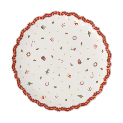 Bring structure and seasonal character to your table with the Villeroy & Boch Toys Delight Footed Cake Plate. With its elevated design, generous surface, and gently scalloped edging, it’s well-suited for serving festive favourites such as stollen, gingerbread, or crisp cinnamon biscuits.This piece belongs to the Toys Delight collection, known for its nostalgic red, green and white illustrations inspired by classic Christmas traditions. Crafted from premium porcelain, it reflects Villeroy & Boch’s long-standing expertise in fine ceramics. Supplied in a decorative gift box, it’s a standout addition to any winter table setting or a collectible for those who enjoy curating seasonal serveware.Hand washing recommended to maintain this footed cake plate's elegant finish.Dimensions: 28cm (L) x 28cm (W) x 10.9cm (H). Weight: 1.05kg.