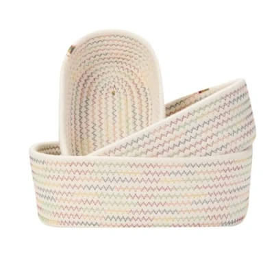 STYLISH AND TIDY - The oval basket is perfect for storing toys, clothing or towels. Whether used as a woven storage container in the living room, as a shelf basket in the children's room or as a decorative organizer in the bathroom, it combines practicality and aesthetic appeal. Braided Rope Mesh - Made of sturdy and durable material with soft touch. This woven basket easily holds small items, helping you keep your home tidy and organized. Versatile use - The simple design fits into any decor. Use it as a decorative basket, storage basket, bathroom organizer or even as an empty gift basket - ideal for tidying up any room and adding warmth to any room. Everyday Practicality - Equipped with built-in slimmer and hidden handles for easy carrying and flexible use. Whether as a towel basket in the bathroom, laundry bin in the bedroom or storage solution for toys and clothing, this product makes everyday life easier. Practical sizes – Available in three sizes (23×13×7cm, 26×16×8cm and 30×17×10cm) – perfectly suitable as changing mat organizer or for storing small items such as toys, cosmetics and kitchen utensils.