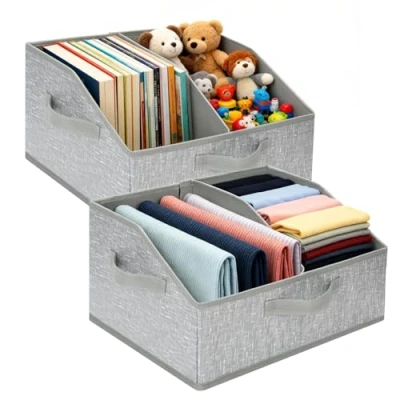 Customizable Organization: These clothes storage boxes feature a unique trapezoidal shape design with removable and adjustable internal partitions via hook and loop closure that allows you to create custom-made compartments for different items such as sweaters accessories or household items offering a flexible home organization solution that adapts to your specific needs LARGE STORAGE CAPACITY: Each closet storage container measures forty by thirty by twenty centimeters and offers a twenty-four liter capacity for a total of two boxes that can hold a substantial amount of personal belongings such as clothing blankets toys or office supplies while keeping every space tidy and free from clutter thanks to their spacious and practical structure STURDY & DURABLE CONSTRUCTION - Made of high quality non-woven fabric these space saving closet storage bins are reinforced with rigid cardboard panels on the sides and bottom to ensure a stable shape and long lasting durability even with frequent use ensuring your things are always safe and well organized EASY CARRY & STORAGE: Equipped with two reinforced handles on each side these storage boxes make it simple and convenient to move them from room to room or take them out of tall shelves when full and can be easily compressed and folded flat for convenient storage in little space when not in use Versatility of use: These storage shelves cubes are ideal for organizing and tidying many environments in the home such as bedrooms closets or offices functioning as practical closet organizer for laundry accessories and sundries helping you keep your home always tidy and easily accessible