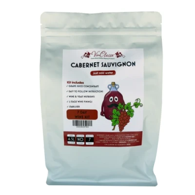 Home Wine Ingredient Kit Makes 6 Bottles of Quality Cabernet Sauvignon Style Red Wine All Ingredients / Sachets Included, No Additional Sugars Required Ready In As Little As 7 Days VinClasse Wine Ingredient Kit Is Made From Quality Grape Concentrates And Comes With All The Required Additives As Well As Full Step By Step Instructions. So That In Around 7 to 10 Days You Can Create A Wine Of Impressive Bouquet, Flavour & Structure. Cabernet Sauvignon Is A Deep Ruby Colour With A Blackcurrant & Cedar Nose. Full bodied With a Tannic Character When Young & Is Capable Of Long Ageing. Tonys TipsCabernet Sauvignon was the first Red Wine I really enjoyed and actually bothered to remember the name because I liked it so much more than the popular cheap wines at that time in the late 60's. This VinClasse equivalent is excellent and reminds me of those valued wine pioneering days!
