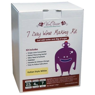 Makes 23 Litres / 5 gallons (Approx 30 Bottles) Of Italian Style White Wine - Ready To Drink In Around 7 Days & Will Improve Further Over Following Weeks. VinClasse 2kg Wine Kits Contain Approx 1 1/2 Litres Of 100%, High Quality Varietal Grape Juice Concentrate, To Achieve A Well Balanced Wine, Near The Commercial Equivalent. You Will Require 4kgs Of Additional Sugar Kit Includes Grape Juice, Extract Favouring, Wine Yeast / Nutrients, Stabiliser, Finings & Full Easy To Follow Instructions. Requires Basic Wine Making Equipment & Bottles (Not Included). Tony's Tips30 bottles of good quality wine in 7 days! . . . . VinClasse "White Box" winesare exceptional value for money. Did you know that Italy is now the largest World-wide producer of wine "Italian White" indicates High Quality in the Italian Stylerather than a particular Grape or Growing Region. This kit definitely lives up to the highly acclaimed reputation synonymous with Italian Wines especially if infused with Oak Chips at the start of the first fermentation (also available from Balliihoo) and then finally left to mature in the bottle for a few weeks . . . . Patience is a virtue!