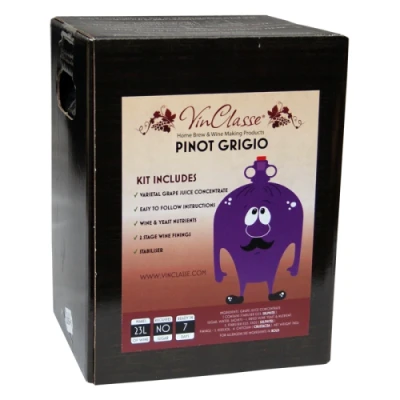 AmazonMakes 23 Litres / 5 gallons (Approx 30 Bottles) Of Quality Pinot Grigio Wine - Ready To Drink In Around 7 Days & Will Improve Further Over Following Weeks. VinClasse 7kg Wine Kits Contain Approx 7 Litres Of 100%, High Quality Varietal Grape Juice Concentrate, To Achieve A Well Balanced Wine, Near The Commercial Equivalent. No Additional Sugar Is Required. Kit Includes Grape Juice, Wine Yeast / Nutrients, Stabiliser, Finings & Full Easy To Follow Instructions. Requires Basic Wine Making Equipment & Bottles (Not Included).