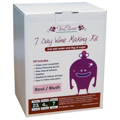 Makes 23 Litres / 5 gallons (Approx 30 Bottles) Of Rose Blush Wine - Ready To Drink In Around 7 Days & Will Improve Further Over Following Weeks. VinClasse 2kg Wine Kits Contain Approx 1 1/2 Litres Of 100%, High Quality Varietal Grape Juice Concentrate, To Achieve A Well Balanced Wine, Near The Commercial Equivalent. You Will Require 4kgs Of Additional Sugar Kit Includes Grape Juice, Extract Favouring, Wine Yeast / Nutrients, Stabiliser, Finings & Full Easy To Follow Instructions. Requires Basic Wine Making Equipment & Bottles (Not Included). Tony's Tips30 bottles of good quality wine in 7 days! . . . . VinClasse "White Box" wines are exceptional value for money. "Rose" is a Generic term used for this VinClasse medium grape Blend, often best served chilled and great with shellfish and summer salads. Oh those wonderful, endless Salad "Daze" that stretch from sometime before before Midday to well after Midnight! . . . . A little maturing in the bottle is preferable if practical! I like to save some for next year and the year after! . . . . great thought, but if I'm honest probably unrealistic! . . . . However, Patience is still a virtue!