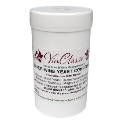 Specially Formulated For High Alcohol. Containes High Quality Wine Yeast And A Mix Of Three Nutrients Speedy Fermentation & Clearing. sage - 1 Heaped Teaspoon Per Gallon To Be Added Direct To Wine Must. Tony's TipsObviously, as the name suggests, this is the Yeast Compound you need to produce Super Wine! Simply follow the instructions and just taste the difference! the Compound works well to produce a higher strength finish to your home made wines and Clears more quickly. VinClasse Super Wine Yeast Compound comes in two sizes 60g or 250g.