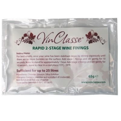 VinClasse Wine Finings - 2 Part Sachet. Treats 5 Gallons / 23 Litres. Two Part Kit, With Instructions. Tonys TipsThese wine finings are in a 2 part sachet that contain Kieselsol (Silicic Acid) and Chitosan from the treatment of Crustacean shells and egg shell and effectively drag out impurities in the fermented must prior to bottling. Not always required as the must will eventually self clear but this treatment certainly will speed the clearing process for a faster, brighter start on your latest batch of wine!