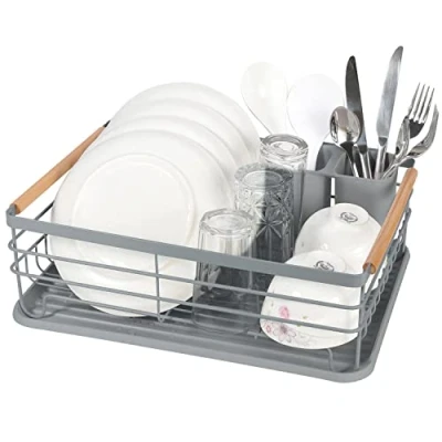 WOODEN HANDLE MINIMALIST DESIGN: The unique style of the minimalist clean look with the wooden handle is attractive to the sight, comfortable to grasp, and control. It can also be used to hang towels in the kitchen. SPACE SAVER: There is plenty of room for dishes, plates, bowls, cups, and other kitchen utensils. Attached are two plastic containers for spoons, forks, knives, and chopsticks. Saves space and keeps things tidy. DURABLE QUALITY: Made of stainless steel, waterproof, rust-free, protects against scratches, corrosion-resistant, and prevents discoloration. REMOVABLE DRAIN TRAY: Removable drip tray makes it easy to handle water and keep a dry dishing rack, ensuring a clean kitchen environment. EASY ASSEMBLY: Simple to put together with clear instructions, and it just takes a few minutes to set up. Dimension: W42.5 x L30.5 x H14cm