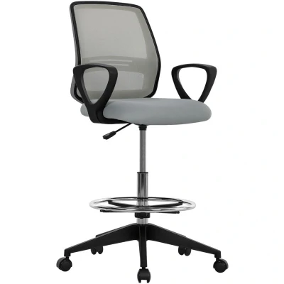 General description For a tall office chair that's designed to complement high worktops at home or in the office, the Vinsetto Draughtsman Chair is an excellent choice. With an adjustable height range of 102.5 to 126 cm, this chair features an ergonomic design that provides prolonged support. It includes a comfortable foam-padded seat, a curved mesh back, high-rise arms, and a round metal footrest to prevent your legs from dangling. Technical specifications Colour: Light Grey Material: Mesh Fabric, Plastic, Foam, Metal Footrest Overall Dimensions: 68L x 66D x 100-120H cm Seat Dimensions: 48W x 46D x 56-76H cm Back Height (to the seat): 45.5 cm Armrest Size: 31L x 5.5W x 18H (to the seat) cm Footrest Size: Ф45 cm x 24-41 H cm Weight Capacity: 120 kg Item Label: 921-187V70LG Usage Draughtsman chair design suitable for higher surfaces Ergonomic design for comfort during extended use 360º swivel base for easy movement around the workspace Other information BS5852 certified fabric and