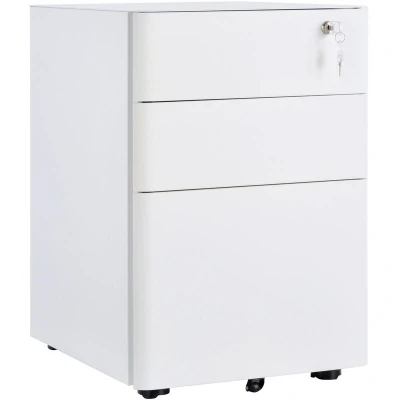 Vinsetto Lockable File Cabinet with 3 Drawers, Steel Rolling Filing 5 Wheels and Pencil Case, Vertical Office Drawer for A4, Letter, Legal Size, Pre Assembled Body, White