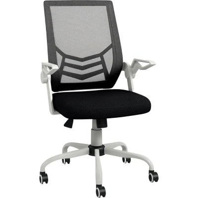 General description For long working hours, the Vinsetto Mesh Swivel Office Chair is designed to keep you comfortable and supported. This chair features a wide, padded seat and a slightly curved back that works with your spine for optimal support. The breathable mesh back ensures airflow, making it suitable for extended use. It is equipped with five wheels for easy mobility. Technical specifications Colour: Black, White Material: Sponge, Nylon, PP, Mesh (polyester), Linen (polyester) Overall Dimension: 62.5W x 55D x 94-104H cm Seat Dimension: 47W x 47D x 45-55H cm Armrest Height (to Seat): 18 cm Back Size: 43.5W x 51L cm Max Load: 120 kg Item Label: 921-547V70BK Installation Assembly required Usage Adjustable seat height for personalized comfort Swivel seat for easy movement Flip-up armrests allow the chair to fit under desks Rocking motion feature for added relaxation