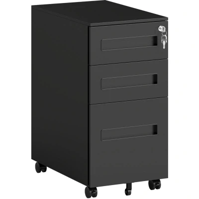 ManoManoGeneral description Easy office organization is made simple with the Vinsetto Lockable Mobile Filing Cabinet. This compact design fits snugly underneath your desk and features two small drawers with a removable pencil tray, along with a larger drawer, providing ample space for files and more. The adjustable bottom rail accommodates A4, legal, and letter files, while the cabinet is equipped with wheels for easy mobility. Technical specifications Colour: Black Material: Steel Overall Dimensions: 30W x 43.5D x 60H cm Drawer Inner Size: 23.5W x 40.5D x 7H cm (small), 23.5W x 40.5D x 24H cm (large) Pencil Tray Size: 24W x 10.7D x 2.2H cm Weight Capacity: 30 kg (overall), 15 kg (top), 5 kg (drawer) Item Label: 924-100V00BK Usage Ideal for organizing office supplies and documents Lockable drawers for secure storage Wheels allow for easy movement around the office Other information