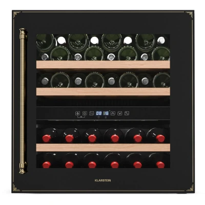 ManoManoGeneral description The Klarstein Vinsider Victoria 36 wine refrigerator combines vintage design with optimal functionality, making it an essential addition for any wine enthusiast. With a capacity of up to 36 bottles across two cooling zones, this dual-zone wine cooler ensures your wines are stored at the ideal temperature and in style. Technical specifications Capacity: 36 bottles Temperature range: 5 to 22°C Dimensions: 59 x 60 x 56.3 cm (WxHxD) Weight: 36 kg Cable length: 1.5 m Noise level: 41 dB Compatibility and accessories Includes 3 removable wooden shelves Comes with a power cable Multilingual user manual included Installation Built-in ready for seamless integration into any kitchen Usage Regular cleaning is recommended for optimal storage Temperature adjustments can be made easily via the intuitive touch control