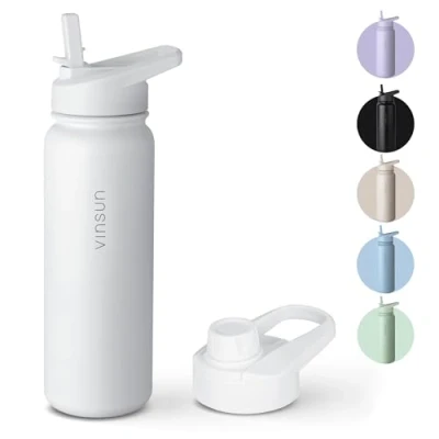 Reusable and sustainable stainless steel drinking bottle ideal for sparkling water, soft drinks, tea or coffee, with a capacity of 750ml, a diameter of 77mm and a height of 275mm. Two lids for your needs - One with a generous drinking opening and the other with a flip-up straw. The lids are made of BPA-free plastic with a silicone seal and have a screw cap. Perfect insulation - The double-walled stainless steel insulation keeps your drinks at the desired temperature for hours - whether hot or refreshingly cold. The metal water bottle is leak-proof, suitable for carbonic acid and unbreakable. The life span can also be extended by rinsing the stainless steel gym bottle by hand. Environmentally friendly - This stainless steel sports bottle can be used as often as you like, a sustainable alternative to disposable bottles. The material is unbreakable, BPA-free, tasteless and odourless., Weight: 0.82893810512 pounds, Manufacturer: VINSUN