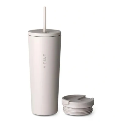 VINSUN Travel Mug with Straw 720ml Stainless Steel Thermal Mug, Leakproof, Double Walled Insulated Beige Tumbler and Lid for Hot & Cold Drinks