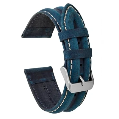 VintageTime Watch Straps Smooth Suede Double Ridge Padded Leather Bracelet with White Stitch Stainless Steel Buckle Choice of Width & Colours 18mm, 20mm or 22mm Bands (Blue, 22mm)