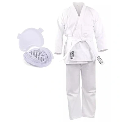 Complete Karate Uniform Set: Includes white poly-cotton jacket, trousers, matching belt, and protective gum shield in a storage case Durable & Breathable Fabric: Made from a high-quality poly-cotton blend designed for comfort and long-lasting performance during training Traditional Martial Arts Design: Wrap-around jacket with reinforced stitching and adjustable drawstring waist for a secure, classic fit Includes Gum Shield for Safety: Protective mouth guard included for safe sparring and contact drills, with case for hygiene and storage Flexible Sizing Options: Elastic waistband and loose-fit design allow freedom of movement and accommodate various body types