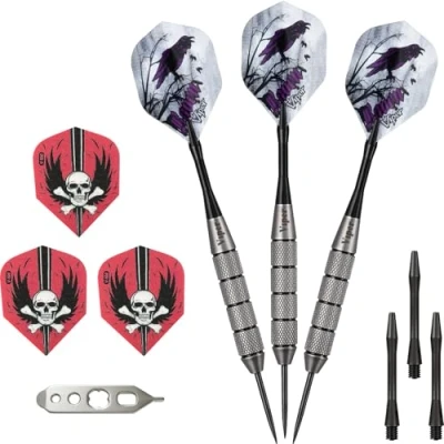 Tungsteel alloy barrels provide best bang for the buck with high strength and smooth styling, giving these darts a Tungsten appearance. Front loaded grooved barrels provide an excellent and consistent grip throw after throw. Aluminum Shafts feature locking holes, making them the most secure way to fasten shafts to barrels and improve stability. High speed slim dart flights feature your choice of four different intimidating graphic designs for a fearsome look and feel. Includes six flights, three extra nylon replacement shafts, and Dart mechanic repair tool.