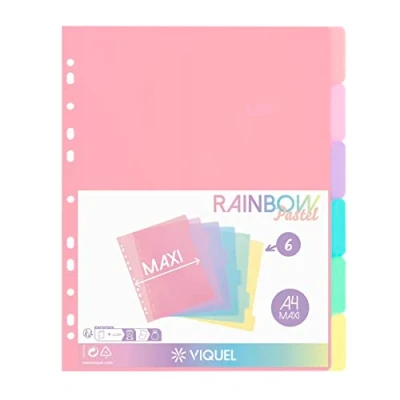 Viquel Set of 6 Plastic dividers Rainbow Pastel Maxi Format (24.5 x 30.5 cm) for A4 Binder or Lever Arch File Colour