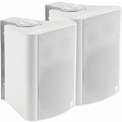 A 5.25″ woofer is complemented by a Mylar dome tweeter. The dome tweeter offers a wide dispersion so everyone in the room can hear at the same volume. This means loud and clear sound for meeting rooms and classrooms. The volume dial is on the rear of the ‘master’ loudspeaker – the one containing the amplifier. It is alongside the hard power switch. The brackets allow installers to easily tilt side to side, and the use of a dome tweeter means the speakers can be mounted on their sides allowing downward tilt. Alternately, leave the brackets off and use as shelf speakers. The rear panel of the master loudspeaker offers minijack and 2-phono (RCA) inputs.