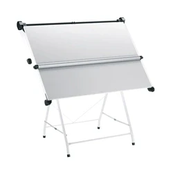 Drawing board with folding floor stand. Stand folds away for storage when not in use. Sturdy 22mm thick melamine surface. Counterweight parallel motion for smooth straightedge movement. Straightedge adjusts for use with thicker materials.