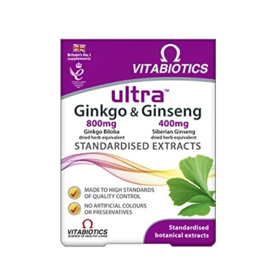 Each Ultra Ginkgo & Ginseng tablet from Vitabiotics contains the equivalent of 800mg Ginkgo Biloba Extract & 150mg Siberian Ginseng Extract. Both Siberian Ginseng & Ginkgo Biloba can help contribute to normal mental performance and cognitive function. Siberian Ginseng can also help contribute to the normal function of the immune system. All Vitabiotics supplements are produced to Good Manufacturing Practice (GMP) standards of quality control, and offer ideal support from sensible, balanced formulae, without excessive levels. All Ultra products (excluding Ultra Vit B Complex) can be taken alongside any multinutrient product in the Vitabiotics range for that additional boost.