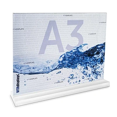 Elegant acrylic display ideal as a T-stand for displaying your offers and promotional messages. Use: Counter, table, sales stand, fair, POS. Format: DIN A3. Width: 42.0 cm. Height: 29.7 cm. Satin base: Length: 42.0 cm. Width: 7.5 mm. Thickness: 2.0 cm. Made in Germany by original plexiglass, non-fading, UV stable. Please note that the acrylic glass top comes with a protective film which must be removed before use.