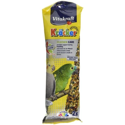 General description Vitakraft Kracker Feather Care for cockatiels and parrots is a delicious and nutritious treat designed to promote feather condition while keeping your bird's beak trim. These sugar-free kracker sticks are specifically formulated for moulting birds and are baked three times on a natural wooden stick, ensuring a delightful taste that birds love. Technical specifications Composition: Cereals, seeds, derivatives of vegetable origins, minerals, honey Supplemented additives: Contains colourings and preservatives Feeding instructions A kracker should always be available in your bird's cage. Other information Practical cage clip for easy attachment Storage conditions: Keep dry and cool