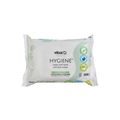 Why Buy Me? Vital Baby HYGIENE super soft hand & face wipes, specially created for your baby's hands and face. They're fragrance-free, alcohol-free, and hypoallergenic, ensuring they're safe for even the most sensitive skin. Whether it's a post- playtime mess or after meals, these 30 wipes are perfect for home use or when you're on the go, leaving your baby feeling clean and refreshed. The resealable lid preserves freshness and prevents drying out, so you're always ready for quick clean-ups. Brand: Vital Baby Product Type: Wipes Product Sub-type: Baby Wipes Colour: White Age: Suitable for Newborn Unit Count : 30 Pcs Material: Detail : These wipes are biodegradable,super soft and gentle on baby’s delicate skin hypoallergenic, alcohol-free, paraben-free fragrance-free. Dermatologically tested. Perfect for just about any messy situation, our HYGIENE super soft fragrance free hand and face wipes are kind on baby’s delicate skin.