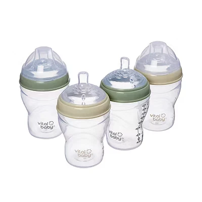 Vital Baby Nurture Breast Like 0m+ Feeding Bottles, 240ml 4pk, Self Sterilising in 3 Mins, Triple Anti Colic Valves, Slow Flow Teats, EarthSmart Biodegradable, BPA Free