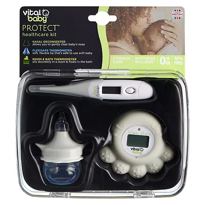Vital Baby PROTECT Healthcare Kit for 3pcs Room and Bath Thermometer, Nasal Aspirator, Body Digital Thermometer Essential Newborn Health Safety, Design may vary