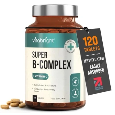 REASSURINGLY EXPENSIVE - VitaBright Super B Complex is not for cost-cutters. If you’re after quality and results, read on. Our doses are much higher than cheaper options, and carefully balanced by our clinical nutritionist for efficient nutritional support. There are eleven B vitamins and, unlike low-budget alternatives, our formula includes all of them. It also includes vitamin C because of its many complementary functions with the B vitamins. BODY-READY METHYLATED B COMPLEX VITAMINS - We manufacture using more pricey ingredients. Our vitamins are methylated and in their active, body-ready forms so they don’t need your own enzymes to modify them before they can get to work. The active formula includes active vitamin B3 (niacinamide), active vitamin B6 (high strength P-5-P), 5-MTHF methyl folate and B12 supplements as methylcobalamin & adenosylcobalamin. HOW TO USE - Take 2 tablets a day. The bottle lasts 2 months. Our tablets are slimline and easy to swallow, coated with vegetable fibre (hypromellose) so they glide down easily. This is the only way to disguise the bitter taste of B vitamins - when they’re at the strong doses in our supplement. We don’t make liquid, spray or drops, which have weaker doses to make the taste acceptable. B VITAMIN COMPLEX PROVEN HEALTH BENEFITS (CLAIMS AUTHORISED BY EFSA) - The B vitamins contribute to energy-yielding metabolism and the reduction of tiredness and fatigue, functioning of the nervous system, psychological function and mental performance, the immune system, hormonal activity, macronutrient metabolism and cardiovascular health (homocysteine metabolism, formation of red blood cells and heart function). BEST OF BRITISH QUALITY - VitaBright vitamin B complex tablets are made in Britain, in BRC accredited grade AA manufacturing facilities operating to GMP standards. We use only the finest ingredients, double seal all bottles, and test for heavy metals to ensure there is no compromise on quality or safety. VitaBright Vitamin B Complex with folate delivers potent, premium B vitamins for women and men who want above average quality.