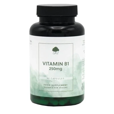 PURE VITAMIN B1 THIAMINE: Each vegetable capsule provides 250mg of pure vitamin B1 thiamine hydrochloride. WHY THIAMINE HYDROCHLORIDE?: There are two common forms of thiamine used in vitamin B1 supplements: thiamine hydrochloride (HCL) and thiamine mononitrate. Most supplement companies avoid using thiamine hydrochloride because of its more complex and time-consuming manufacturing process. However, at G&G, we are dedicated to using this form for its superior effectiveness. WHAT DOES VITAMIN B1 DO?: Vitamin B1 contributes towards a healthy diet in many ways. Vitamin B1 contributes to normal function of the nervous system, heart, normal psychological function and normal energy-yielding metabolism. WHY CHOOSE G&G?: At G&G, we manufacture all our own supplements. By maintaining complete control over the production process, we ensure that you receive the highest quality supplements possible. SUITABLE FOR VEGANS: This supplement is suitable for vegans, non-GMO, and free-from artificial colourings and preservatives. MANUFACTURED IN THE UK: Manufactured in our own Sussex-based cleanroom, running off of green energy. All our products are made to the highest British manufacturing standards.