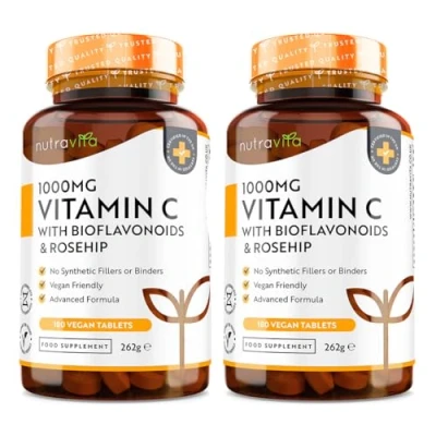 Vitamin C 1000mg (2 Packs of 180) 360 Vegan & Vegetarian VIT Tablets 1 Year Supply High Strength Ascorbic Acid Added Bioflavonoids Rosehip Normal Immune System UK Made by Nutravita