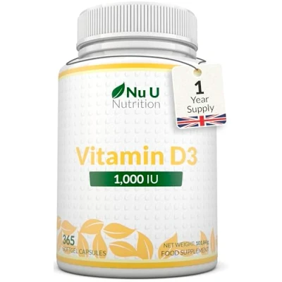 365 SOFTGELS – 1 YEAR SUPPLY – Each bottle provides a full year’s supply of Vitamin D3 in convenient, easy-to-swallow softgels. Just one softgel a day delivers 1000 IU (25 μg) of Vitamin D3 as cholecalciferol, the preferred form used in most nutritional supplements, to support your daily intake. SUPPORTS IMMUNE FUNCTION & BONES – Vitamin D contributes to the normal function of the immune system and to the maintenance of normal bones and teeth. It also contributes to normal absorption and utilisation of calcium and phosphorus.* *EFSA approved claims MUSCLE FUNCTION & ENERGY – Vitamin D contributes to the maintenance of normal muscle function and plays a role in the process of cell division, making it an important nutrient for overall wellbeing*. *EFSA approved claims CONVENIENT DAILY DOSE – Our softgels are small, odourless and easy to take with water, designed for everyday use by men and women of all ages. Each serving provides a consistent dose of Vitamin D3 in a practical once-a-day format. THE NU U NUTRITION STORY - TRUSTED SUPPLIER OF NUTRITIONAL SUPPLEMENTS - Starting as a family business in 2014, we’ve expanded to offer a diverse range of high-quality supplements designed to support different lifestyles. Our mission is to make wellness simple, with premium ingredients that cater to your daily nutritional needs—whether for general health or targeted goals.