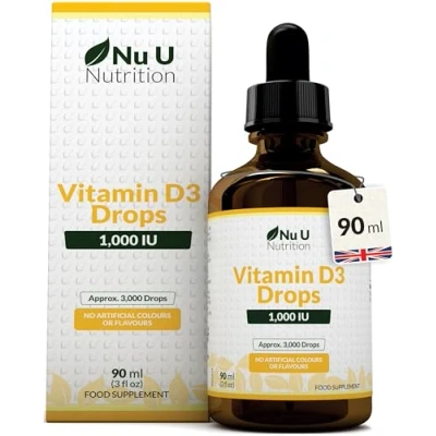 50% MORE - You can enjoy incredible value for money with our premium Vit D3 supplement in liquid form. We offer 90ml equivalent to 3,000 drops per bottle. Incredible value in comparison to other supplements which typically offer just 60ml. One bottle will last you well over a year so there is no need to worry about running out or re-ordering every few months. The pipette allows for the option for flexible dosage so you can adapt the dosage to your needs, even up to 10,000 IU every 10 days. HIGH BIOAVAILABILITY - Our high strength D3 is delivered in an MCT (medium-chain triglyceride) oil derived from fractionated Coconuts. Aside from it being easier to consume sublingually, being in liquid form also offers increased bioavailability and absorption over regular vitamin d3 capsules, softgels or tablets. Each serving provides 25μg of unflavoured Vitamin D3 which you can either drop into your mouth or add to a glass of water. How convenient! JUST THE GOOD STUFF - You will find no hidden nasties here! Our Vitamin D3 drops are free of any GMO ingredients, artificial flavourings, colourants or sweeteners. We have also ensured that our Vitamin D drops are allergen free including gluten, wheat, lactose, soy and nut traces. The bottle can be recycled with your glass collection. HEALTH BENEFITS - Sunlight is the most common source of Vitamin D but most people don’t get enough exposure to it to remain healthy. With Vitamin D3 being so vitally important for a number of functions carried out by our bodies. Vitamin D contributes to the maintenance of normal bones, teeth and muscle function as well as to the normal function of the immune system as substantiated by the European Food Safety Authority (EFSA.)* THE NU U NUTRITION STORY - TRUSTED SUPPLIER OF NUTRITIONAL SUPPLEMENTS - Starting as a family business, we’ve expanded to offer a diverse range of high-quality supplements designed to support different lifestyles. Our mission is to make wellness simple, with premium ingredients that cater to your daily nutritional needs—whether for general health or targeted goals.