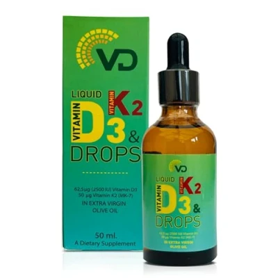 ππππ ππππππππ: 0.5 ml VD Liquid Vitamin D3 K2 Drops in Extra Virgin Olive Oil contains 62.5 mcg (2500 IU) of vitamin D3 and 50 Β΅g of vitamin K2 (MK-7). One 50ml bottle provides approximately 1,700 drops of this high-strength vitamin D3 and K2 formula. The included dropper allows for easy and flexible dosing, making it convenient for individual needs. ππππππ ππππππ, πππππ, πππππ, πππ πππππππ: Vitamin D3 and K2 work together to support the immune system while helping maintain strong bones, teeth, muscles, and joints. This combination enhances calcium and phosphorus absorption, ensuring bone density and nail strength. ππππ πππππππ πππ πππππππ ππππππππ πππππππππ: Our vitamin d3 k2 drops are lab-tested for purity and quality. We use pure Cholecalciferol (vitamin D3) and Menaquinone MK-7 (vitamin K2) without any additives, stabilisers, GMOs, lactose, or gluten. These d3 and k2 vitamin drops are also free from common allergens, including gluten, wheat, soy, lactose, and nut traces. ππππππππππ π